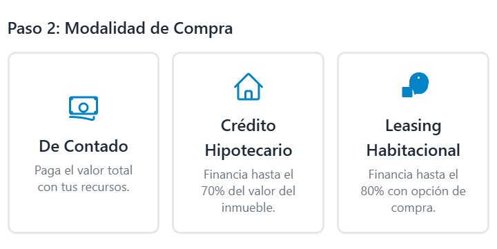 Formas de pago: De contado, Crédito Hipotecario, Leasing Habitacional.